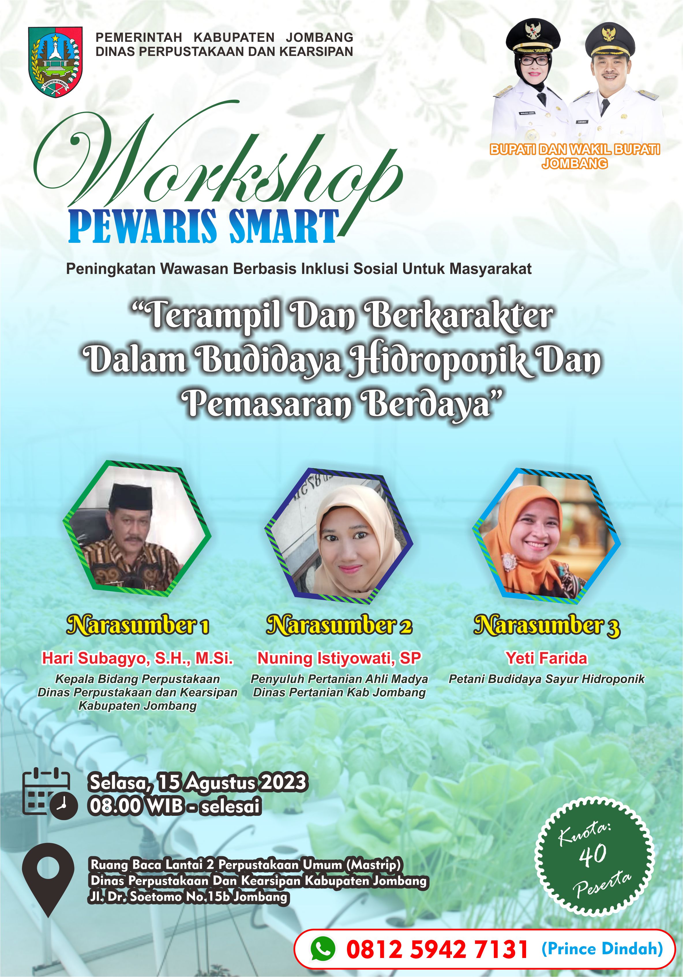 Hari Selasa, 15 Agustus 2023 bertempat di Ruang Layanan lantai 2 Perpustakaan Umum pada Dinas Perpustakaan dan Kearsipan (Disperpusip) Kab. Jombang Jl. dr. Soetomo 15b Jombang dilaksanakan even kegiatan Peningkatan Wawasan Berbasis Inklusi Sosial Untuk Masyarakat (Pewaris Smart). Tema yang diangkat : “Terampil dan Berkarakter Dalam Budidaya Hidroponik Dan Pemasaran Berdaya”. Dengan narasumber Yeti Farida seorang petani budidaya sayur hidroponik dari Desa Morosunggingan Kecamatan Peterongan.