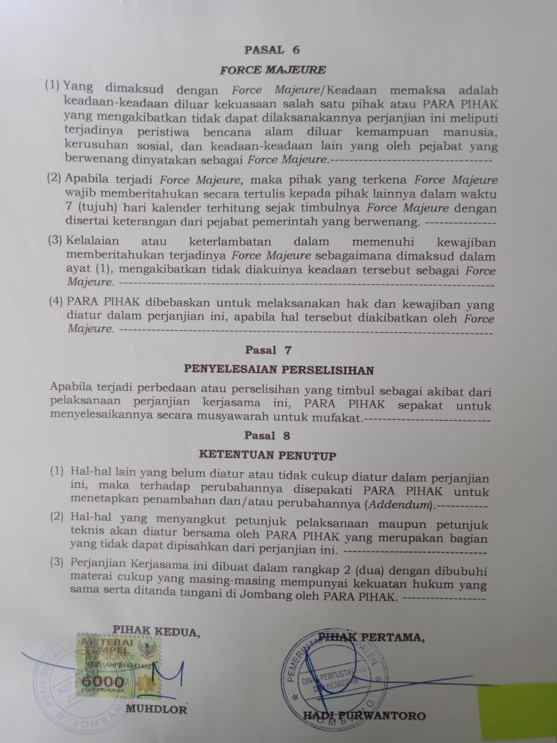 Telah dilaksanakan penandatanganan perjanjian kerjasama antara Dinas Perpustakaan dan Kearsipan Kabupaten Jombang dengan kecamatan Jombang pada tanggal 28 Desember 2020.