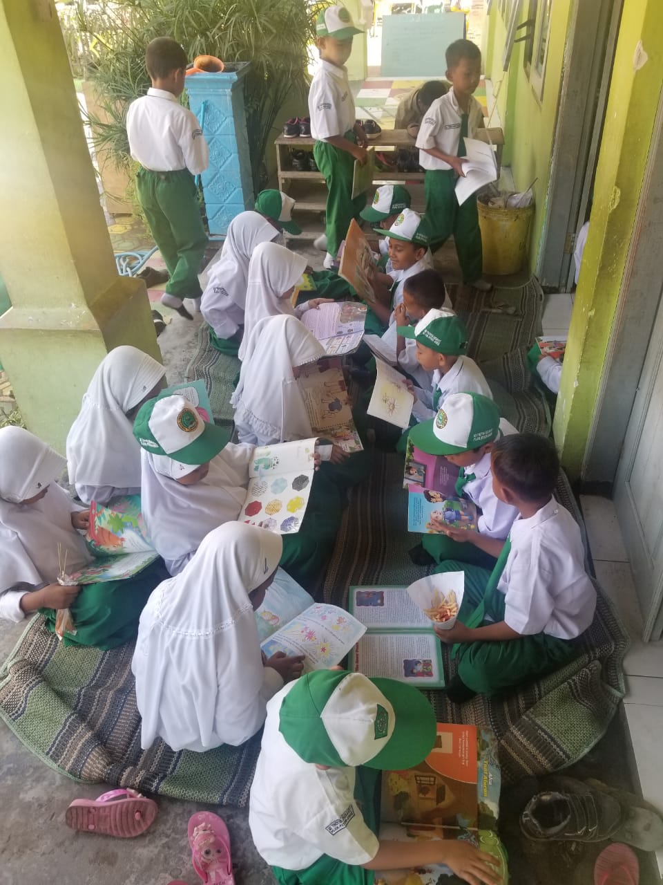 Berjajar rapi di kelas, di halaman, di koridor hingga ada yang disamping mobil pusling, dengan khidmat membaca buku yang telah dipilih.
